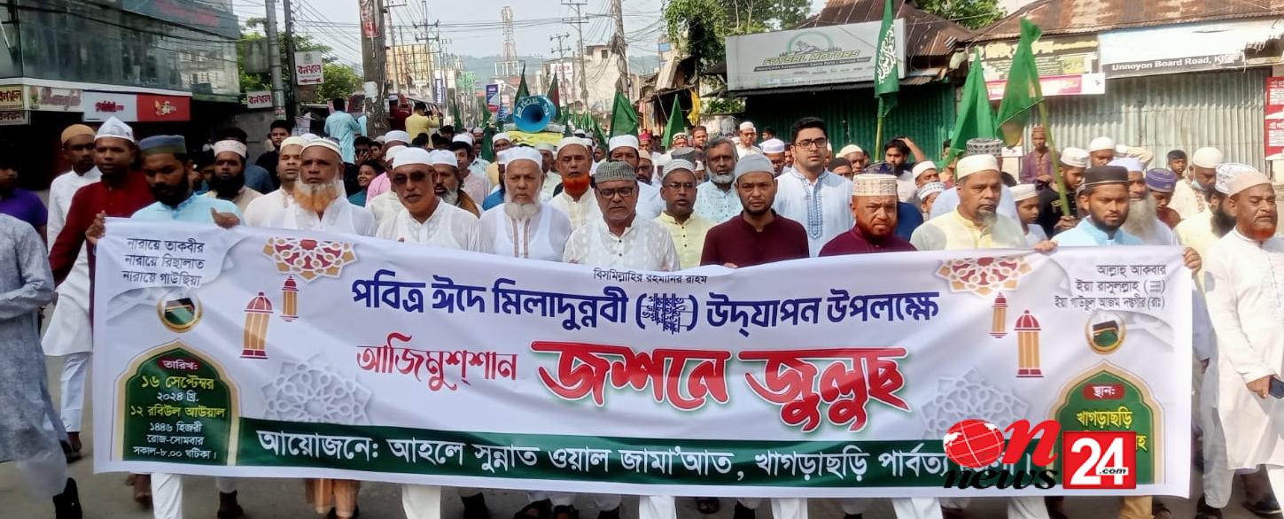 এ সময় ধর্মপ্রাণ মুসল্লিরা নানা রঙ-বেরঙের ব্যানার, ফেস্টুন ও কলেমা খচিত পতাকা নিয়ে ‘নারায়ে তাকবির- আল্লাহু আকবর, নারায়ে রিসালাত-ইয়া রাসুলাল্লাহ’ ধ্বনিতে স্লোগান দিতে থাকে। এতে মুখরিত হয়ে উঠে পুরো খাগড়াছড়ি শহর।