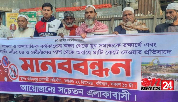 রোববার সকালে কুমিল্লার দেবিদ্বার উপজেলার খলিলপুরে নদীর বাঁধের উপর এ মানববন্ধন হয়।এতে সচেতন এলাকাবাসীর ব্যানারে খলিলপুর, আসানপুর বালিবাড়ীর চর, বারেরার চর ও লক্ষিপুরের শতাধিক স্থানীয় লোকজন অংশগ্রহণ করেছেন।