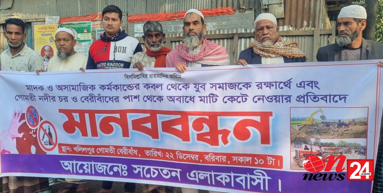 রোববার সকালে কুমিল্লার দেবিদ্বার উপজেলার খলিলপুরে নদীর বাঁধের উপর এ মানববন্ধন হয়।এতে সচেতন এলাকাবাসীর ব্যানারে খলিলপুর, আসানপুর বালিবাড়ীর চর, বারেরার চর ও লক্ষিপুরের শতাধিক স্থানীয় লোকজন অংশগ্রহণ করেছেন।