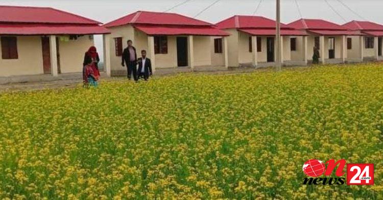 একই সারিতে ৪০টি আবাসনের সামনের ফসলী মাঠে শীতের হিমেল হাওয়ায় দুলছে সরিষার হলদে ফুল। বিশাল মাঠ জুড়ে সরিষা ফুলের মোহনীয় রূপের সাথে বাড়তি মাত্রা যোগ করছে আশ্রয়ণ প্রকল্পে আবাসনের নির্ধারিত লাল রংয়ের টিনের ঢেউ।