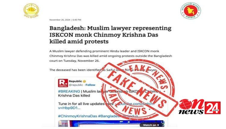 মঙ্গলবার (২৭ নভেম্বর) দিবাগত রাতে বাংলাদেশ সংবাদ সংস্থার (বাসস) এক প্রতিবেদনে বলা হয়, আইনজীবী সাইফুল ইসলাম আলিফকে চিন্ময় কৃষ্ণ দাসের আইনজীবী বলে দাবির বিষয়ে প্রধান উপদেষ্টার প্রেস উইং এক ফেসবুক পোস্টে জানিয়েছে, দাবিটি মিথ্যা এবং এটি অসৎ উদ্দেশ্য নিয়ে ছড়ানো হচ্ছে।