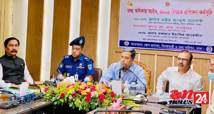 বঙ্গবন্ধু কন্যা জননেত্রী শেখ হাসিনা আইন করে জনগণকে তথ্য পাওয়ার স্বাধীনতা দিয়েছেন। নিদিষ্ট কিছু বিষয় ছাড়া তথ্য দিতে কোন সমস্যা নেই কেউ তথ্য দিতে অপারগতা প্রকাশ করলে আপিল করতে হবে। আপিলেও কোন সমাধান না আসলে তথ্য কমিশনে অভিযোগ করা হলে নিদিষ্ট কিছু সময়ের মধ্যে আমরা তা সমাধান করে দিব। তথ্য অধিকার আইন ২০০৯, বিষয়ক প্রশিক্ষণ কর্মসূচীতে প্রধান অতিথি হিসাবে উপস্থিত থেকে তথ্য কমিশনার (সিনিয়র সচিব) ড. আব্দুল মালেক এ কথাগুলো বলেন। রবিবার ১২ জুন সকাল ১০ টার সময় নীলফামারীতে জেলা প্রশাসকের সম্মেলন কক্ষে প্রশিক্ষনের আয়োজন করে তথ্য কমিশন। এতে প্রধান অতিথি ছিলেন তথ্য কমিশনার (সিনিয়র সচিব) ড. আব্দুল মালেক।
