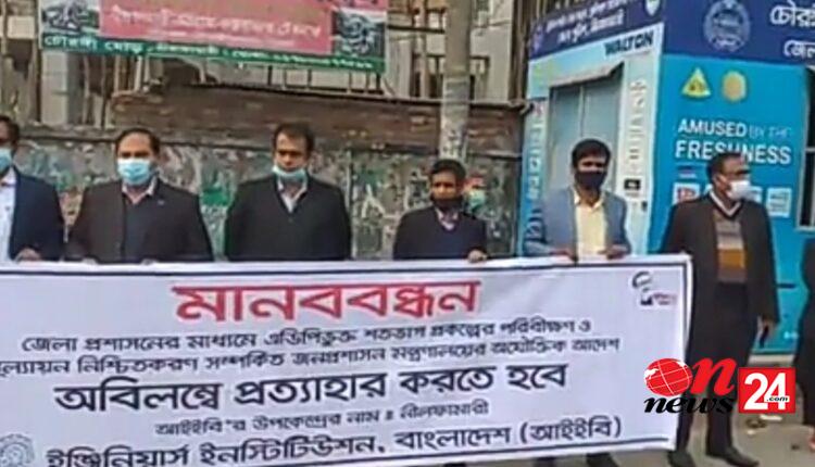 জেলা প্রশাসনের মাধ্যমে এডিপিভূক্ত শতভাগ প্রকল্পের পরিবীক্ষণ ও মূল্যায়ন নিশ্চিতকরণ সম্পর্কিত জনপ্রশাসন মন্ত্রণালয়ের অযৌক্তিক আদেশ নিশ্চিতকরণ সম্পর্কিত জনপ্রশাসন মন্ত্রণালয়ের আদেশ অবিলম্বে প্রত্যাহারের দাবিতে নীলফামারীতে মানববন্ধন করেছে ইঞ্জিনিয়ার্স ইন্সটিটিউশন বাংলাদেশ (আইবি)।