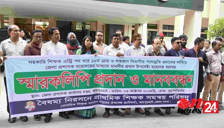 জয়পুরহাটে দশম গ্রেডে উন্নীতকরণের দাবিতে মানববন্ধন করেছেন প্রাথমিক বিদ্যালয়ের শিক্ষকরা