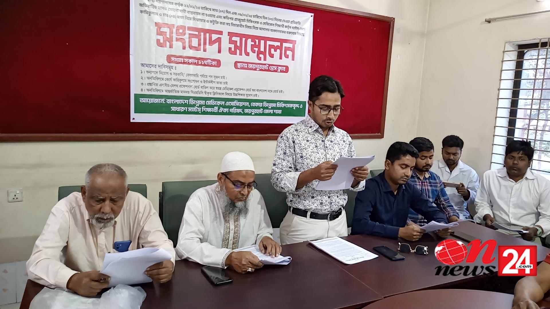 বুধবার (৫ মার্চ) দুপুরে জয়পুরহাট প্রেসক্লাব মিলনায়তনে বাংলাদেশ ডিপ্লোমা মেডিকেল এসোসিয়েশন, বেকার ডিপ্লোমা চিকিৎসক ও সাধারণ ম্যাটস শিক্ষার্থীদের ব্যানারে এ সংবাদ সম্মেলন অনুষ্ঠিত হয়।
