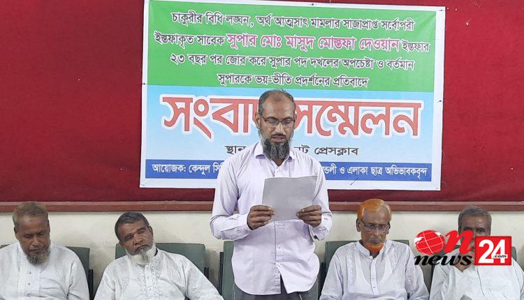 লিখিত বক্তব্যে অভিযোগ করা হয়, আমাদের মাদ্রাসার সাবেক সুপার মোঃ মাসুদ মোস্তফা দেওয়ান তার দায়িত্ব পালনকালে অর্থ আত্মসাৎ, চাকুরীর শৃঙ্খলা ভঙ্গসহ নানা অনিয়ম দূর্নীতির কারনে একাধিক বার (১৯৯৯ সালের ১ জুন ও পরবর্তীতে অর্থ আত্মসাৎ মামলায় ২০০১ সালের ১২ এপ্রিল জেল হাজাতে গেলে সাময়িক বরখাস্ত হন। তারপর জেল-হাজতবাস শেষে নিজের অপকর্ম আড়াল করতে অবশেষে ব্যাক্তিগত কারন দেখিয়ে ২০০১ সালের ৬ সেপ্টেম্বর ইস্তফা পত্র প্রদান করলে তা দাপ্তরিক প্রক্রিয়া শেষে ওই বছর ১৫ সেপ্টেম্বর ম্যানেজিং কমিটির সভায় অনুমোদন হলে সুপারের পদ শুন্য হয়ে যায়।