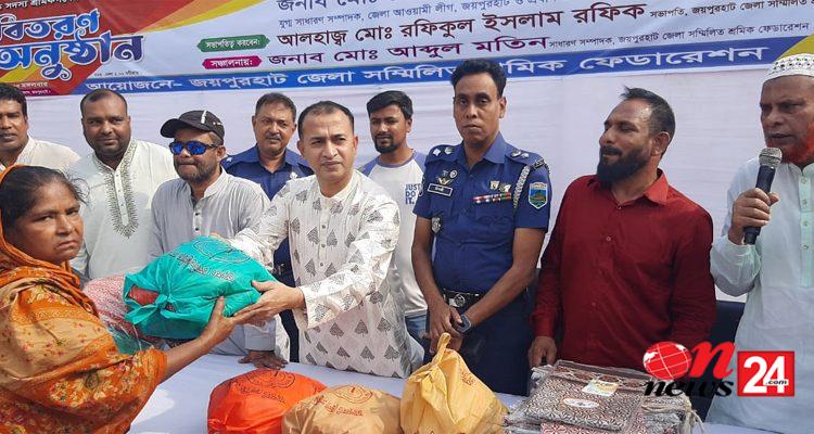 জয়পুরহাটে সম্মিলিত শ্রমিক ফেডারেশনের ঈদ সামগ্রী বিতরণ