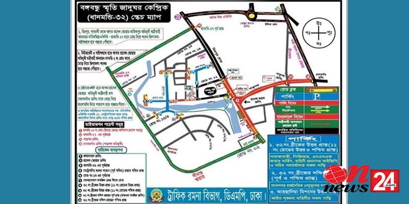 বিজ্ঞপ্তিতে জানানো হয়, অনুষ্ঠানে আগত অতিথিদের যানবাহন সুষ্ঠুভাবে চলাচল ও যানজট পরিহারের লক্ষ্যে ধানমন্ডি-৩২, জাতির জনক বঙ্গবন্ধু শেখ মুজিবুর রহমান স্মৃতি জাদুঘর এলাকায় চলাচলরত গাড়িচালক/ব্যবহারকারীদের ১৫ আগস্ট ভোর থেকে অনুষ্ঠান শেষ না হওয়া পর্যন্ত গমনাগমনের জন্য নিম্নোক্ত পথ অনুসরণের অনুরোধ করা হলো-