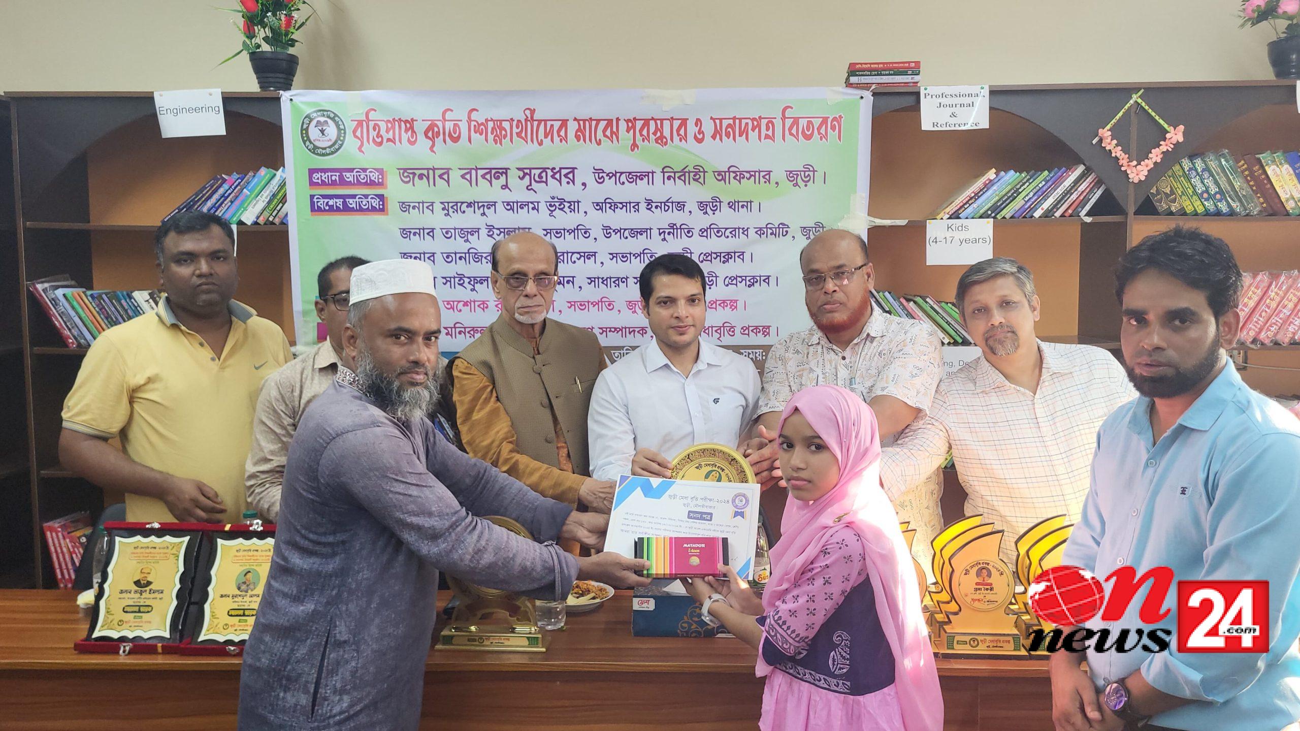 মৌলভীবাজার জেলার জুড়ীতে “জুড়ী মেধাবৃত্তি পরীক্ষায় বৃত্তিপ্রাপ্ত কৃতি শিক্ষার্থীদের মাঝে পুরষ্কার ও সনদপত্র প্রদান করা হয়েছে। বুধবার (১৯ নভেম্বর) সানাবিল লাইব্রেরীতে ২০২৪ ইং সালের জুড়ী মেধাবৃত্তি প্রকল্পের পরীক্ষায় বৃত্তিপ্রাপ্ত কৃতি শিক্ষার্থীদের মাঝে সংবর্ধনা অনুষ্ঠানে বৃত্তি প্রকল্পের সভাপতি অশোক রঞ্জন পালের সভাপতিত্বে প্রধান অতিথির বক্তব্য রাখেন জুড়ী উপজেলা নির্বাহী অফিসার বাবলু সূত্রধর।