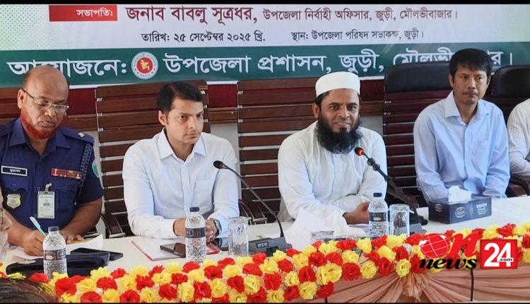 জুড়ী উপজেলা নির্বাহী অফিসার বাবলু সূত্রধর এর সভাপতিত্বে সভায় উপস্থিত ছিলেন জুড়ী থানার ওসি মোঃ মুরশেদুল আলম ভূঁইয়া, উপজেলা দুর্নীতি প্রতিরোধ কমিটির সভাপতি প্রবীণ শিক্ষাবিদ মো: তাজুল ইসলাম, উপজেলা বিএনপির সভাপতি মাছুম রেজা, জেলা জামায়াতের নায়েবে আমির মাওলানা আব্দুর রহমান, উপজেলা জামায়াতের আমির আব্দুল হাই হেলাল, পিডিবি’র আবাসিক প্রকৌশলী মোঃ কবীর আহমেদ, জুড়ী সরকারি কলেজের উপাধ্যক্ষ ফরহাদ আহমেদ, উপজেলা স্বাস্থ্য ও পরিবার পরিকল্পনা কর্মকর্তা ডাঃ সমরজিৎ সিংহ, উপজেলা পরিবার পরিকল্পনা কর্মকর্তা মোঃ ফখরুল ইসলাম চৌধুরী, উপজেলা একাডেমিক সুপারভাইজার তাহমিনা চৌধুরী, সাবেক মুক্তিযোদ্ধা কমান্ডার কুলেশ চন্দ্র চন্দ, জুড়ী প্রেসক্লাবের সাধারণ সম্পাদক সাইফুল ইসলাম সুমন, সাংগঠনিক সম্পাদক মনিরুল ইসলাম, ফুলতলা শাহনিমাত্রা কলেজের অধ্যক্ষ মোঃ জহির উদ্দিন, হাজী আপ্তাব উদ্দিন আমিনা খাতুন কলেজের অধ্যক্ষ ফারহানা সামছি চৌধুরী, হযরত শাহখাকী (র:) আলিম মাদ্রাসার অধ্যক্ষ মাওলানা ইয়াকুব আলী, বাংলাদেশ পূজা উদযাপন ফ্রন্টের আহ্বায়ক দিবাকর দাস, সদস্য সচিব শাওন দে, ফুলতলা ইউনিয়ন পরিষদের ভারপ্রাপ্ত চেয়ারম্যান দছির আলী, পশ্চিমজুড়ী ইউনিয়ন পরিষদের ভারপ্রাপ্ত চেয়ারম্যান সিরাজুল ইসলাম, সাগরনাল ইউনিয়ন পরিষদের ভারপ্রাপ্ত চেয়ারম্যান শরফ উদ্দিন, উপজেলা সহকারী শিক্ষা অফিসার মাহমুদ হোসাইন, অরবিন্দ কর্মকার, জুড়ী ফায়ার সার্ভিস স্টেশনের সাব অফিসার এস এম শামীম, দৈনিক প্রথম আলো প্রতিনিধি কল্যাণ প্রসূন চম্পু, উপজেলা যুব উন্নয়ন কর্মকর্তা মোঃ আলমগীর হোসেন, জুড়ী মডেল সরকারি উচ্চ বিদ্যালয়ের ভারপ্রাপ্ত প্রধান শিক্ষক হাফছা হাবিবা লুপা, মক্তদীর বালিকা উচ্চ বিদ্যালয়ের প্রধান শিক্ষক ইসহাক আলী, পূর্বজুড়ী ইউনিয়ন পূজা উদযাপন ফ্রন্টের সভাপতি সুভাষ রুদ্র পাল, গোয়ালবাড়ী ইউনিয়ন পূজা উদযাপন ফ্রন্টের সাধারণ সম্পাদক সুব্রত দে দিপু, ফুলতলা ইউনিয়ন পূজা উদযাপন ফ্রন্টের সভাপতি স্বপন মল্লিক, জাঙ্গিরাই কালী কাল ভৈরব বাড়ী সভাপতি কন্দ্রপ কন্দ্রপ চন্দ প্রমুখ।