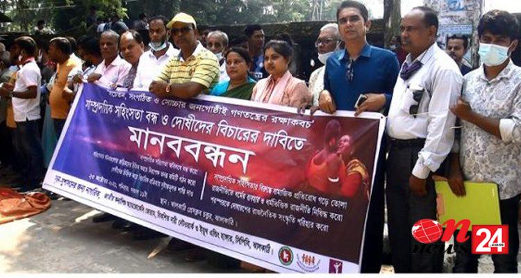 ঝালকাঠিতে সাম্প্রদায়িক সহিংসতা বন্ধ ও দোষীদের বিচারের দাবিতে মানববন্ধন