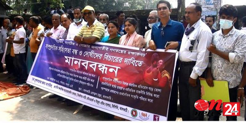 সাম্প্রদায়িক সহিংসতা বন্ধ, জড়িতদের চিহ্নিত করে নিরপেক্ষ তদন্ত কমিটি গঠন, বিচার, সামাজিক প্রতিরোধ গড়ে তোলা, ধর্মভিত্তিক রাজনীতি নিষিদ্ধ ও ফেসবুকে গুজব ছড়ানো বন্ধ করাসহ ১৫ দফা দাবি জানানো হয় মানববন্ধন থেকে।