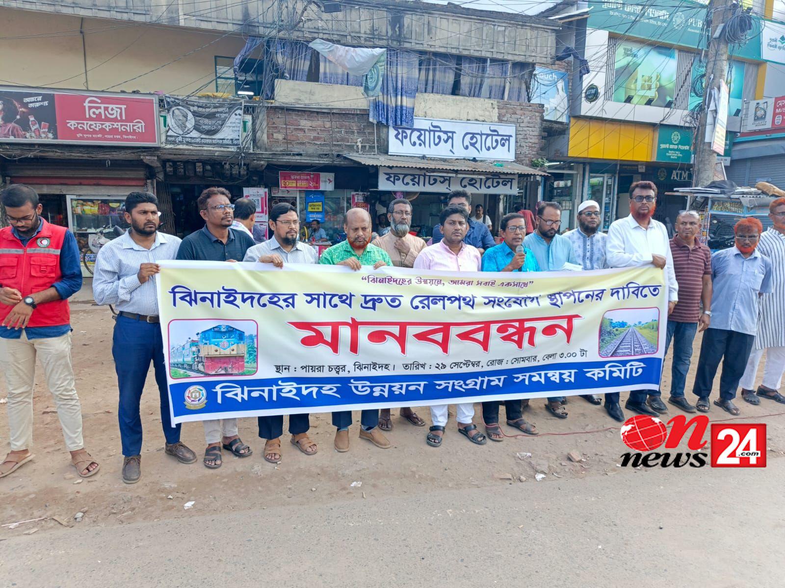 ঝিনাইদহের সাথে দ্রæত রেলপথ সংযোগ বাস্তবায়নের দাবিতে মানব বন্ধন কর্মসূচী পালিত হয়েছে। সোমবার (২৯ সেপ্টেম্বর) বিকাল ৩টায় ঝিনাইদহ শহরের পায়রা চত্বরে এই মানববন্ধন কর্মসূচী পালন করে ঝিনাইদহ উন্নয়ন সংগ্রাম সমন্বয় কমিটি। সমন্বয় কমিটির সহসভাপতি এম এ কবীর এর সভাপতিত্বে অনুষ্ঠিত মানববন্ধনে প্রধান অতিথির বক্তব্য রাখেন ঝিনাইদহ সদর হাসপাতালের তত্বাবধায়ক ডাঃ মোস্তাফিজুর রহমান। অন্যান্যের মধ্যে বক্ততব্য রাখেন দৈনিক নবচিত্র পত্রিকার সম্পাদক আলাউদ্দীন আজাদ, সমন্বয় কমিটির সাধারণ সম্পাদক প্রকৌশলী আবুল বাশার,মোশারফ হোসেন,তাজনুর রহমান,জিয়াউল ইসলাম খান, আব্দুস সবুর,আনোয়ার হোসেন,ফখরুদ্দিন মুন্না,ফারুক হোসেন,দেলোয়ার হোসেন, আলমিরাজ,লিয়াকত হোসেন প্রমূখ।