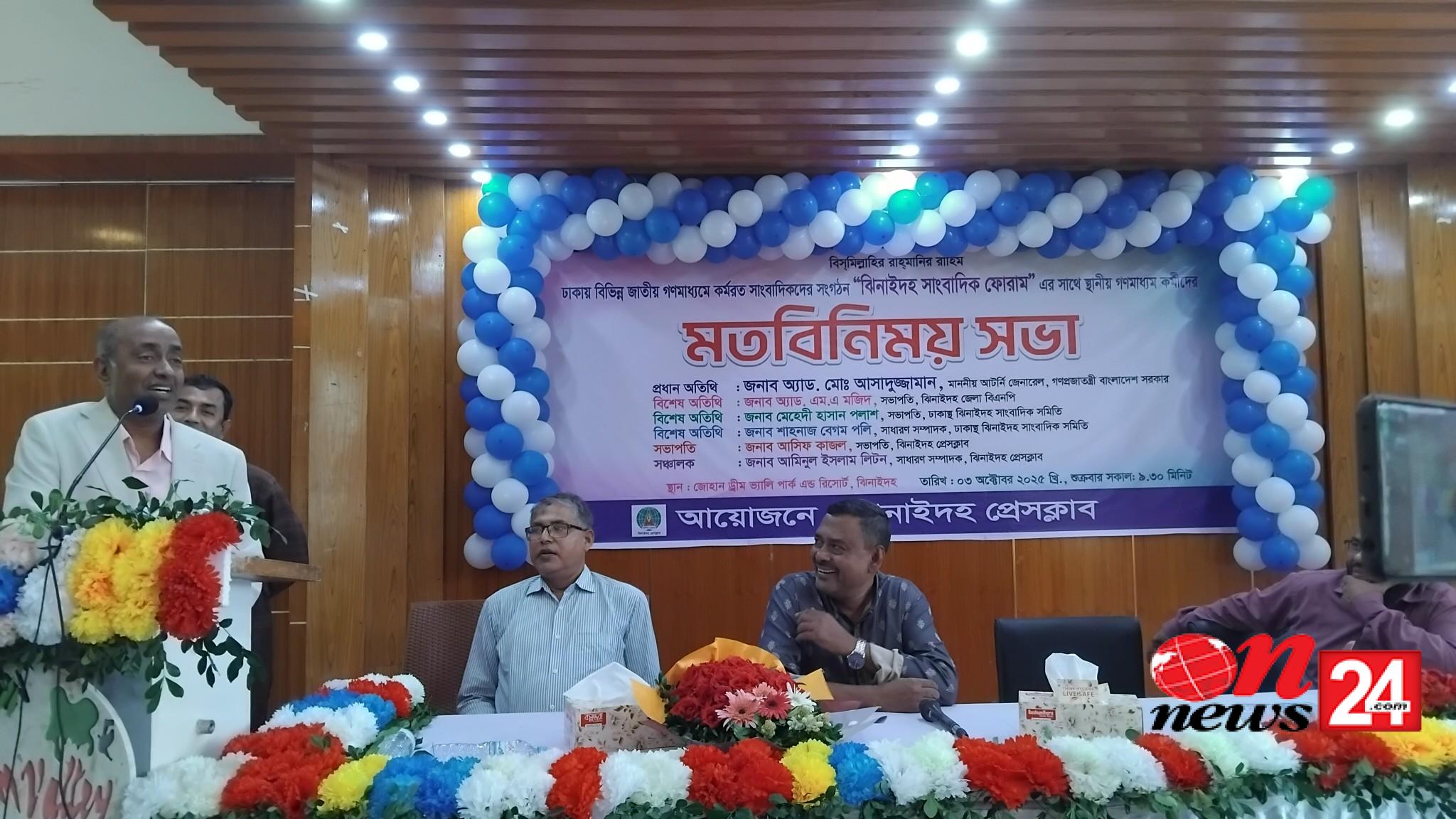 ঝিনাইদহ প্রেসক্লাবের সভাপতি আসিফ কাজলের সভাপতিত্বে অনুষ্ঠিত মতবিনিময় সভায় বিশেষ অতিথি ছিলেন ঝিনাইদহ জেলা বিএনপির সভাপতি এডভোকেট এম এ মজিদ, ঢাকাস্থ ঝিনাইদহ সাংবাদিক ফোরামের সভাপতি মেহেদী হাসান পলাশ, সাধারণ সম্পাদক শাহনাজ বেগম পলি.জাহিদ হোসেন বিল্পব এবং ঝিনাইদহ চেম্বারের সভাপতি মোয়জ্জেম হোসেন। মত বিনিময় সভায় বক্তব্য রাখেন ঝিনাইদহ জেলা রিপোর্টার্স ইউনিটির সভাপতি এম এ কবীর, প্রেসক্লাবের সাধারণ সম্পাদক আমিনুল ইসলাম লিটন, সিনিয়র সাংবাদিক বিমল সাহা,প্রেসক্লাবের সাবেক সভাপতি এম রায়হান, এম সাইফুল মাবুদ, মাহমুদ হাসান টিপু, আজাদ রহমান, শিপলু জামান, এম রাসেল, সরোয়ার হোসেন, আব্দুর রহমান, খন্দকার আব্দুল্লাহ বাশার এবং শাহজাহান নবীন প্রমুখ