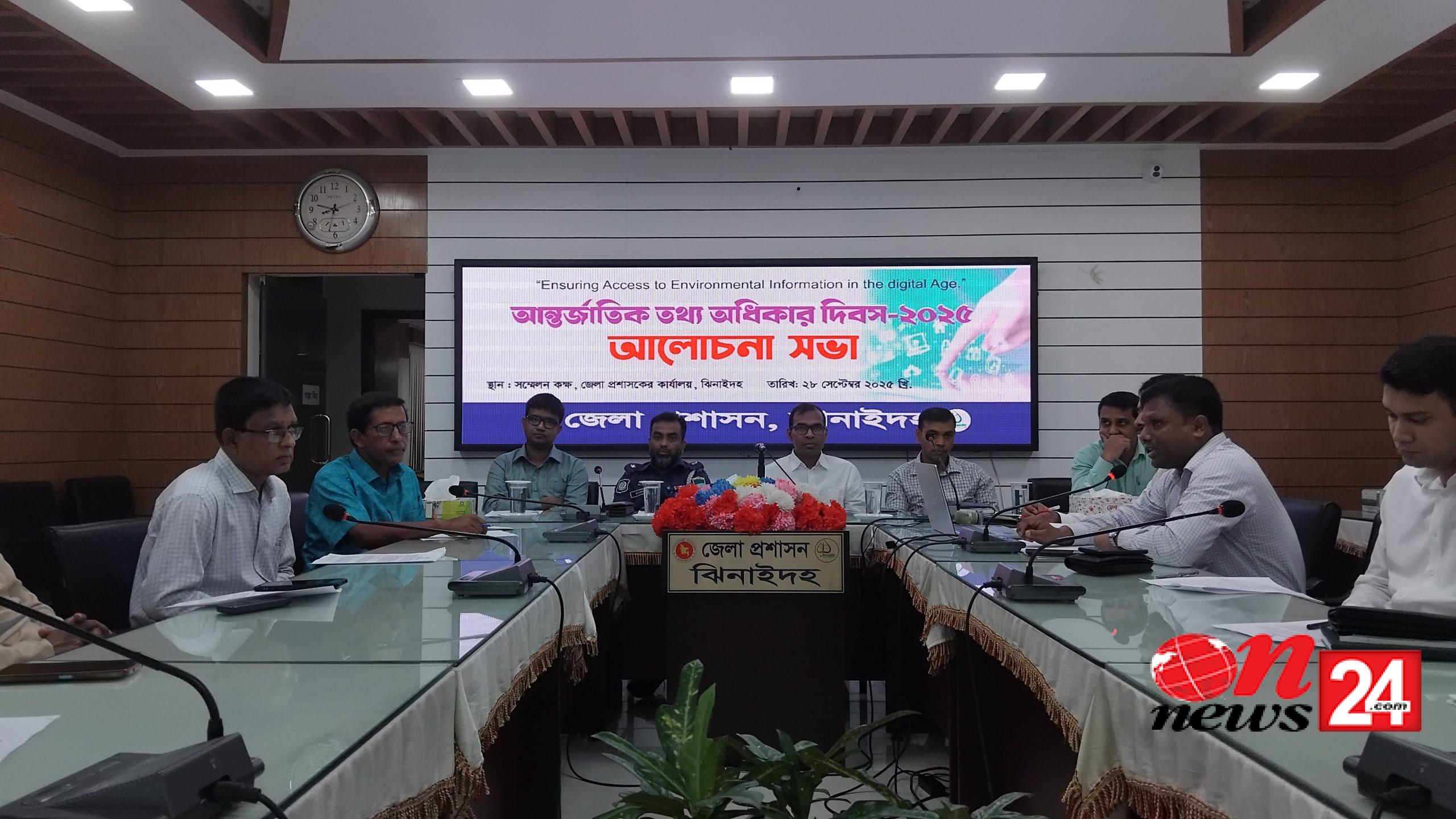 ঝিনাইদহে আন্তর্জাতিক তথ্য অধিকার দিবস পালিত হয়েছে। দিবসটি পালন উপলক্ষে (২৮ সেপ্টেম্বর) রবিবার সকালে জেলা প্রশাসকের সম্মেলন কক্ষে এক আলোচনা সভা অনুষ্ঠিত হয়। অতিরিক্ত জেলা প্রশাসক (সার্বিক) সাইফুর রহমানের সভাপতিত্বে অনুষ্ঠিত আলোচনা সভায় প্রধান অতিথি ছিলেন জেলা প্রশাসক মোহাম্মদ আবদুল আওয়াল। বিশেষ অতিথি ছিলেন স্থানীয় সরকার বিভাগের উপ-পরিচালক রথীন্দ্রনাথ রায়, অতিরিক্ত পুলিশ সুপার ইমরান জাকারিয়া। বক্তব্য রাখেন ঝিনাইদহ জেলা রিপোর্টার ইউনিটির সভাপতি এম এ কবীর এবং ইসলামী আন্দোলন বাংলাদেশের সেক্রেটারি।অনুষ্ঠানের মূল প্রতিপাদ্য ডিজিটাল প্লাটফর্মে উপস্থাপন করেন জেলা তথ্য অফিসার মোঃ আব্দুর রউফ। এর আগে একটি বর্ণাঢ্য রেলি বের করা হয়।