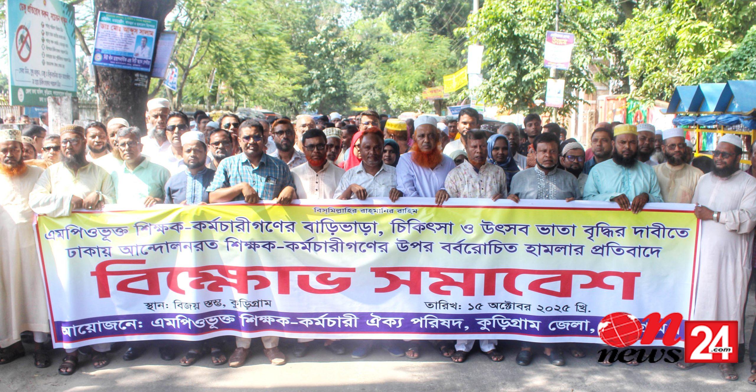 কুড়িগ্রামে এমপিওভুক্ত শিক্ষক-কর্মচারীদের বাড়িভাড়া, চিকিৎসা ও উৎসব ভাতা বৃদ্ধির দাবিতে এবং ঢাকায় আন্দোলনরত শিক্ষক-কর্মচারীদের ওপর বর্বরোচিত হামলার প্রতিবাদে বিক্ষোভ সমাবেশ অনুষ্ঠিত হয়েছে।