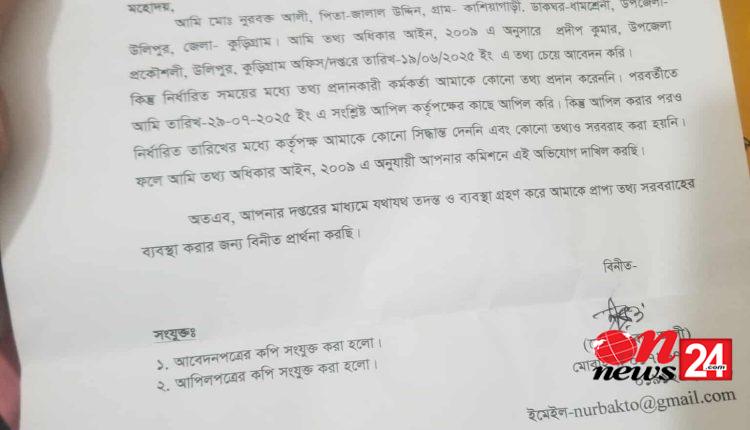 তথ্য না পেয়ে উলিপুর উপজেলা প্রকৌশলী প্রদীপ কুমারের বিরুদ্ধে তথ্য কমিশনে অভিযোগ।