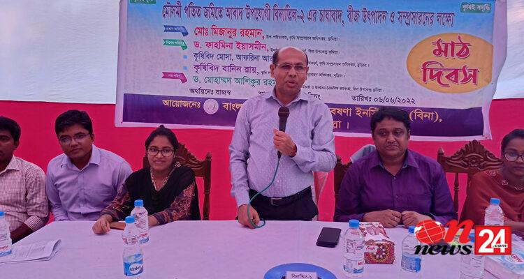 সোমবার বিকেলে কুমিল্লা বুড়িচং উপজেলার ভারত বাংলাদেশের সীমান্তবর্তী পাহাড়পুর এলাকায় মৌসুমি পতিত জমিতে আবাদ উপযোগী বিনা তিল-২ এর চাষাবাদ, বীজ উৎপাদন ও সম্প্রাসরণের লক্ষ্যে বাংলাদেশ পরমাণু কৃষি গবেষণা ইন্সটিটিউট কুমিল্লার উপকেন্দ্রের আয়োজিত মাঠ দিবসে কৃষকরা তিল চাষে নিজেদের আগ্রহ প্রকাশ করেন।