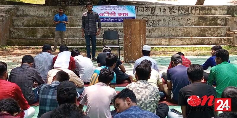 প্রতীকী ক্লাসের শুরুতে অর্থনীতি বিভাগের ১২ তম ব্যাচের শিক্ষার্থী আবির বলেন, আজকে আমরা প্রতীকী ক্লাসের মধ্যে দিয়ে ক্লাস এবং পরীক্ষাসহ সকল অ্যাকাডেমিক কার্যক্রম স্বাভাবিকভাবে ফিরে পাওয়ার দাবি জানাচ্ছি। আমি একজন শিক্ষার্থীদের হয়ে আরও দশজন শিক্ষার্থীকে নিয়ে আজ দাঁড়িয়েছি, এমনটা কি হওয়ার কি কথা ছিল? এ সময়ে আমরা ক্লাসে বসে পরীক্ষা দেওয়ার কথা কিন্তু আজ আমরা কোথায় আছি?