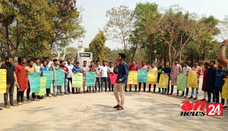 সোমবার (১০ই মার্চ) দুপুর ১টার দিকে বিশ্ববিদ্যালয়ের গোল চত্বরে এই মানববন্ধন করেন তারা।