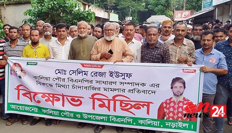 নড়াইলের কালিয়া পৌর বিএনপির সাধারণ সম্পাদক সেলিম রেজা ইউসুফ, পৌর কৃষকদলের আহবায়ক গোলাম রসুল মান্দার, পৌর ছাত্রদল নেতা মিকাইল শেখসহ দলীয় নেতাকর্মীদের বিরুদ্ধে ষড়যন্ত্রমূলক ও উদ্দেশ্য প্রণোদিত চাঁদাবাজির মামলা দায়েরের প্রতিবাদে বিক্ষোভ মিছিল এবং সংবাদ সম্মেলন অনুষ্ঠিত হয়েছে। কালিয়া উপজেলা ও পৌর বিএনপির আয়োজনে বুধবার (৬ আগস্ট) সন্ধ্যায় কালিয়া প্রেসক্লাবে সংবাদ সম্মেলন অনুষ্ঠিত হয়। এর আগে ছোটকালিয়া মোড় থেকে বিক্ষোভ মিছিল বের হয়ে পৌর এলাকার বিভিন্ন সড়ক প্রদক্ষিণ নেতাকর্মীরা। কালিয়া পৌর শ্রমিকলীগের সহ-সভাপতি সাইফুল ইসলাম লিকুর ভাবী রহিমা খানম বাদি গত ৫ আগস্ট কালিয়া থানায় মামলাটি দায়ের করেন। আওয়ামী লীগের দখলকৃত দোকান বুঝে নেয়ায় বিএনপি নেতাদের বিরুদ্ধে এ ষড়যন্ত্রমূলক মামলা করা হয়েছে বলে অভিযোগ করেন ভুক্তভোগী পরিবারসহ বিএনপি নেতারা।