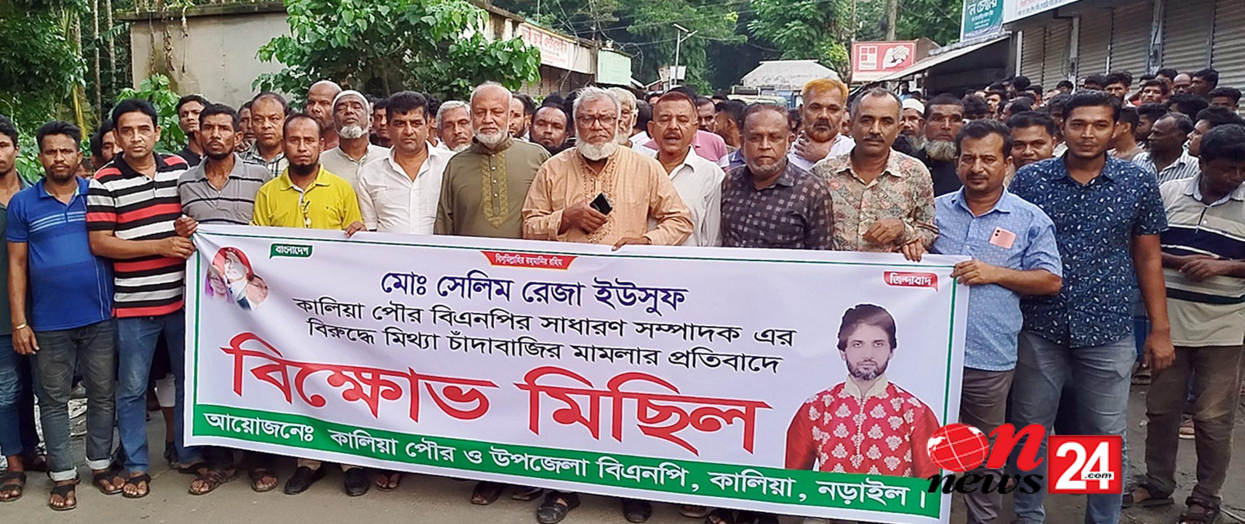 নড়াইলের কালিয়া পৌর বিএনপির সাধারণ সম্পাদক সেলিম রেজা ইউসুফ, পৌর কৃষকদলের আহবায়ক গোলাম রসুল মান্দার, পৌর ছাত্রদল নেতা মিকাইল শেখসহ দলীয় নেতাকর্মীদের বিরুদ্ধে ষড়যন্ত্রমূলক ও উদ্দেশ্য প্রণোদিত চাঁদাবাজির মামলা দায়েরের প্রতিবাদে বিক্ষোভ মিছিল এবং সংবাদ সম্মেলন অনুষ্ঠিত হয়েছে। কালিয়া উপজেলা ও পৌর বিএনপির আয়োজনে বুধবার (৬ আগস্ট) সন্ধ্যায় কালিয়া প্রেসক্লাবে সংবাদ সম্মেলন অনুষ্ঠিত হয়। এর আগে ছোটকালিয়া মোড় থেকে বিক্ষোভ মিছিল বের হয়ে পৌর এলাকার বিভিন্ন সড়ক প্রদক্ষিণ নেতাকর্মীরা। কালিয়া পৌর শ্রমিকলীগের সহ-সভাপতি সাইফুল ইসলাম লিকুর ভাবী রহিমা খানম বাদি গত ৫ আগস্ট কালিয়া থানায় মামলাটি দায়ের করেন। আওয়ামী লীগের দখলকৃত দোকান বুঝে নেয়ায় বিএনপি নেতাদের বিরুদ্ধে এ ষড়যন্ত্রমূলক মামলা করা হয়েছে বলে অভিযোগ করেন ভুক্তভোগী পরিবারসহ বিএনপি নেতারা।