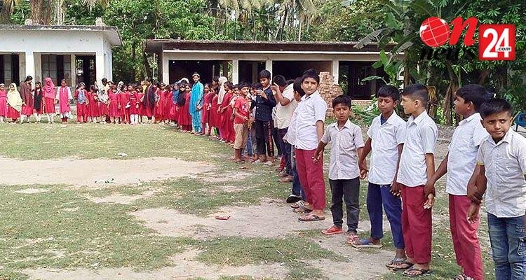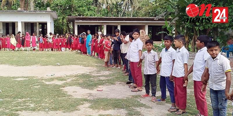 নড়াইলের পূর্বকলাবাড়ীয়া সরকারি প্রাথমিক বিদ্যালয়ের মাঠ দখল করে বাড়ি নির্মাণের প্রতিবাদে মানবববন্ধন
