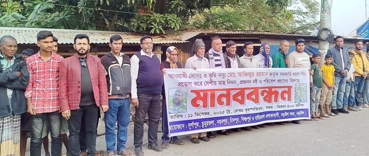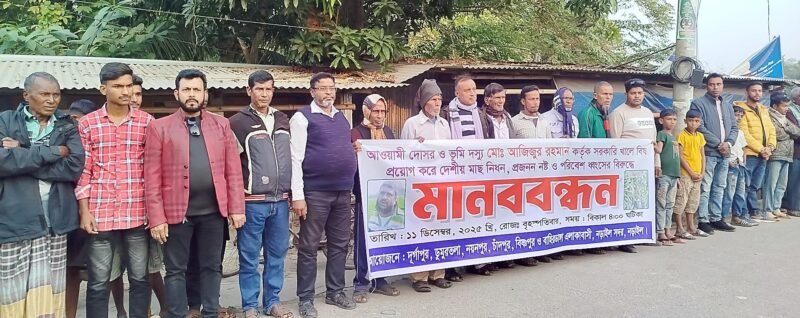 নড়াইলে খালে বিষ দিয়ে দেশি মাছ ধ্বংসের প্রতিবাদে ও দোষীদের গ্রেফতার দাবিতে মানববন্ধন বিক্ষোভ