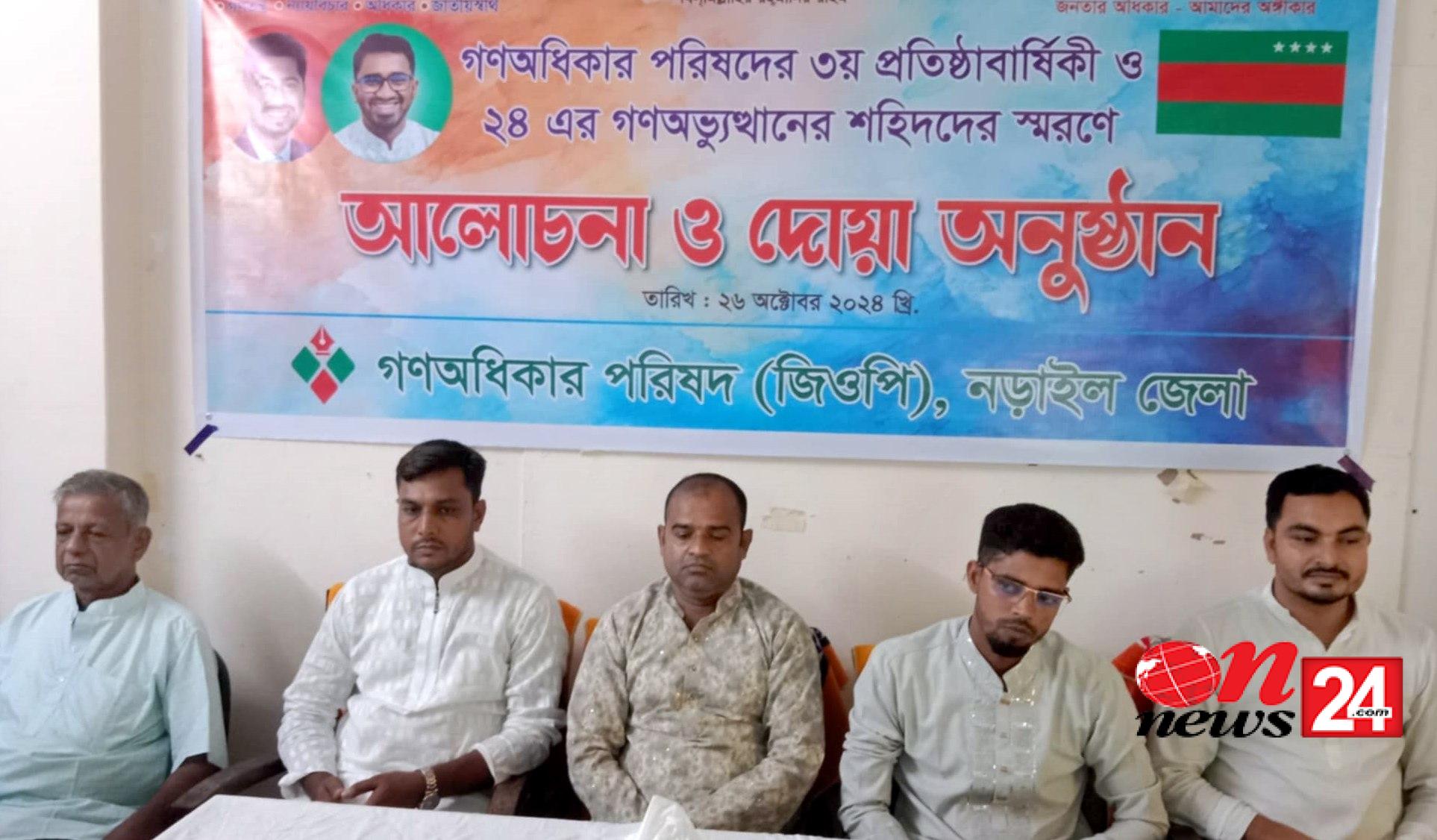 গণ অধিকার পরিষদের ৩য় প্রতিষ্ঠা বার্ষিকী ও ২৪ এর শহীদদের স্মরণে নড়াইলে আলোচনা সভা ও দোয়া অনুষ্ঠিত হয়েছে। শনিবার বিকেলে জেলা গণ অধিকার পরিষদের উদ্যোগে দলীয় কার্যালয়ে এ কর্মসূচি পালিত হয়।