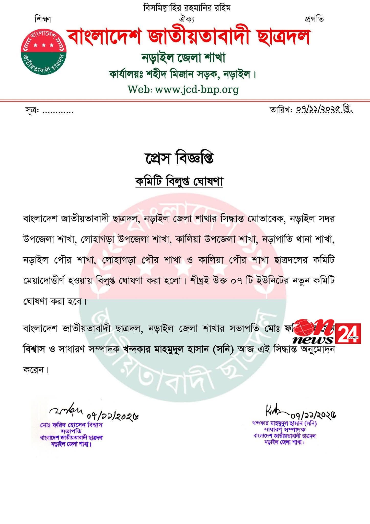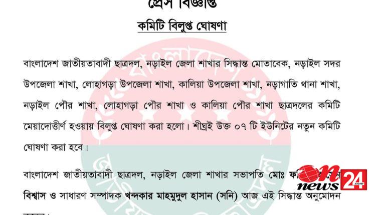 প্রেস বিজ্ঞপ্তিতে জানানো হয়, বাংলাদেশ ছাত্রদলের কেন্দ্রীয় কমিটির নির্দেশনা মোতাবেক মেয়াদোত্তীর্ণ হওয়ায় বাংলাদেশ জাতীয়তাবাদী ছাত্রদল নড়াইল নড়াইল সদর উপজেলা শাখা, লোহাগড়া উপজেলা শাখা, কালিয়া উপজেলা শাখা, নড়াগাতী থানা শাখা, নড়াইল পৌর শাখা, লোহাগড়া পৌর শাখা ও কালিয়া পৌর শাখা কমিটি বিলুপ্ত ঘোষণা করা হলো। শীগ্রই সম্মেলনের মাধ্যমে উক্ত ৭ ইউনিটের নতুন কমিটি ঘোষণা করা হবে।