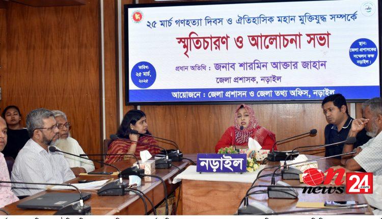 নড়াইলে ২৫ মার্চ গণহত্যা দিবস ও ঐতিহাসিক মহান মুক্তিযুদ্ধ সম্পর্কে স্মৃতিচারণ ও আলোচনা সভা অনুষ্ঠিত হয়েছে। মঙ্গলবার (২৫ মার্চ) দুপুরে জেলা প্রশাসকের সম্মেলন কক্ষে জেলা তথ্য অফিসের আয়োজনে এ অনুষ্ঠানের আয়োজন করা হয়।