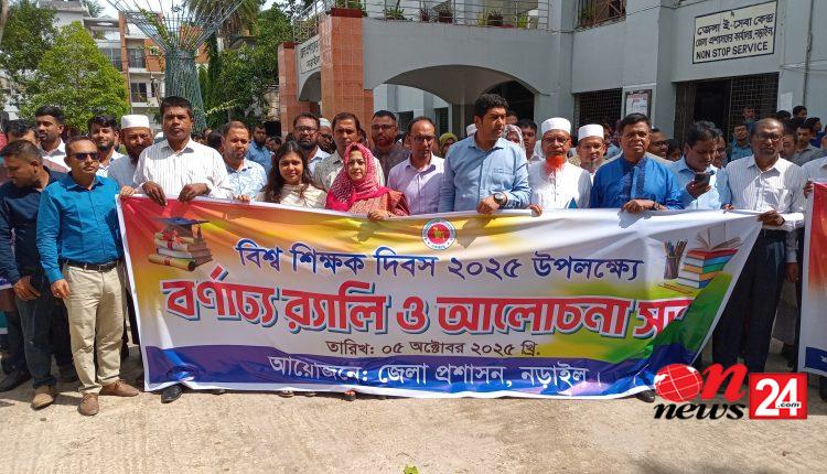 বিশ্ব শিক্ষক দিবস উপলক্ষ্যে নড়াইলে র্যালি ও আলোচনা সভা অনুষ্ঠিত হয়েছে। রবিবার (৫ অক্টোবর) সকাল ১০টায় নড়াইল জেলা প্রশাসনের আয়োজনে এ কর্মসুচি পালিত হয়।