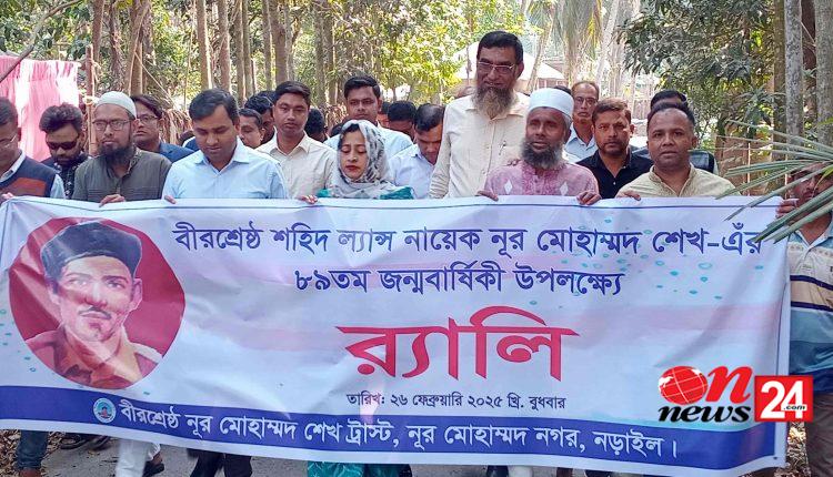 বুধবার(২৬ ফেব্রæয়ারী) সকাল ১০টায় নূর মোহম্মদ নগরে একটি র‌্যালি বের হয়। র‌্যালিটি সড়ক প্রদক্ষিণ শেষে নূর মোহাম্মদের বসতভিটায় নির্মিত স্মৃতিস্তম্ভে গিয়ে শেষ হয়। এসময় স্মৃতিস্তম্ভে নড়াইল জেলা প্রশাসন,মুক্তিযোদ্ধা সংসদ, বীরশ্রেষ্ঠ নূর মোহাম্মদ শেখ ট্রাষ্ট, বীরশ্রেষ্ঠ নূর মোহাম্মদ মহাবিদ্যালয়, বীরশ্রেষ্ঠ নূর মোহাম্মদ মাধ্যমিক বিদ্যালয় সহ বিভিন্ন সংগঠনের পক্ষ থেকে শ্রদ্ধাঞ্জলি নিবেদন করা হয়। পরে জেলা পুলিশের একটি চৌকষ বাহিনী রাষ্ট্রীয় সম্মাননা গার্ড অব অনার প্রদান করেন।