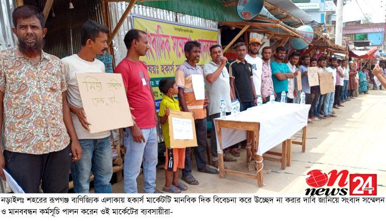 নড়াইল শহরের রূপগঞ্জ বাণিজ্যিক এলাকায় হকার্স মার্কেটটি মানবিক দিক বিবেচনা করে উচ্ছেদ না করার দাবি জানিয়েছেন ওই মার্কেটের ব্যবসায়ীরা। মার্কেটটি উচ্ছেদ করা হলো প্রায় ৩০জন দরিদ্র ব্যবসায়ীর পরিবার নিয়ে মানবেতর জীবন যাপন করতে হবে। বৃহস্পতিবার বেলা ১১ টার দিকে মার্কেটের সামনে মানববন্ধন ও সংবাদ সম্মেলনে বক্তারা এ দাবি জানান।