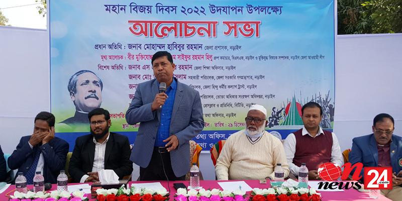 জেলা তথ্য অফিসার ইব্রাহিম আল মামুনের সভাপতিত্বে সভায় মুক্তিযুদ্ধের চেতনায় বাংলাদেশ বিনির্মাণের লক্ষ্যে বর্তমান ও আগামী প্রজন্মকে নিয়ে দিক নির্দেশনামূলক বক্তব্য দেন প্রধান অতিথি নড়াইল জেলা প্রশাসক মোহাম্মদ হাবিবুর রহমান। মুখ্য আলোচনা উপস্থাপন করেন বীর মুক্তিযোদ্ধা মোঃ সাইফুর রহমান হিলু। বিশেষ অতিথি ছিলেন জেলা শিক্ষা কর্মকর্তা এসএম ছায়েদুর রহমান, জেলা গণগ্রন্থাগারের সহকারী পরিচালক তাজমুল ইসলাম, হিন্দুধর্মীয় কল্যাণ ট্রাষ্টের সহকারী পরিচালক দেবাশীষ বাইন, ভোক্তা অধিকার সংরক্ষণ অধিদপ্তর নড়াইল জেলা কার্যালয়ের সহকারী পরিচালক প্রণব কুমার প্রামাণিক, নড়াইল প্রেসক্লাবের সভাপতি এনামুল কবীর টুকু প্রমুখ।