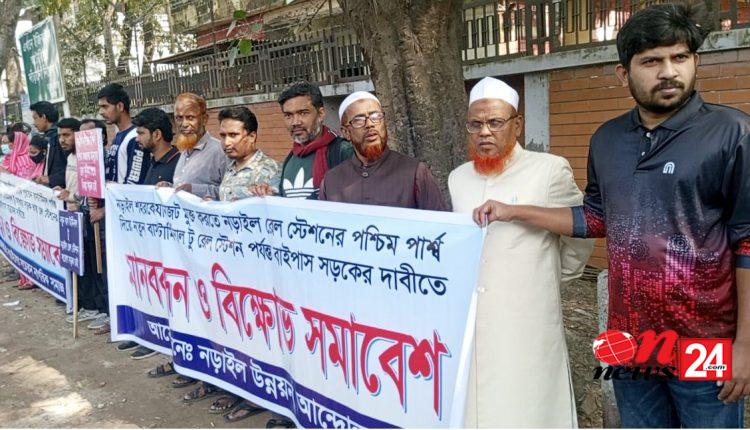 বৃহস্পতিবার (১৯ ডিসেম্বর) বেলা ১১টায় নড়াইল উন্নয়ন আন্দোলনের ব্যানারে আদালত সড়কে এ মানববন্ধন অনুষ্ঠিত হয়। ঘন্টাব্যাপী মানববন্ধন চলাকালে বক্তব্যে নড়াইল উন্নয়ন আন্দোলনের আহবায়ক শরীফ মুনীর হোসেন বলেন, কোটি কোটি টাকা ব্যয়ে নির্মিত নড়্ধাসঢ়;ইল রেল স্টেশনে যাতায়াতের জন্য কোন সড়ক নির্মাণ করা হয়নি। রেলস্টেশনে যাতায়াত ও নড়াইল শহরকে যানজটমুক্ত করতে শহরের পাশ দিয়ে রূপগঞ্জ হতে গো-চর পর্যন্ত একটি বাইপাস সড়ক নির্মাণ জরুরী হয়ে পড়েছে। অন্যথায় শহরে যানজটের কারনে মানুষের জীবন অতিষ্ঠ হয়ে উঠবে।’