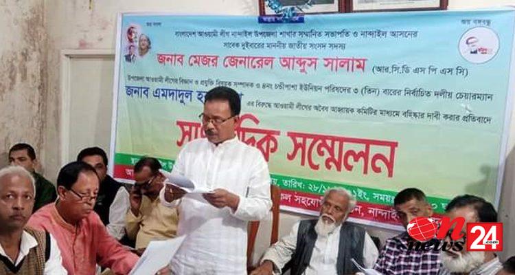লিখিত বক্তব্যে তিনি বলেন, বিগত উপজেলা পরিষদ নির্বাচনের আওয়ামিলীগের বিদ্রোহী বিজয়ী প্রার্থী হাসান মাহমুদ জুয়েল গত ২৬ নভেম্বর এক সংবাদ সম্মেলন ডেকে নান্দাইল উপজেলা আওয়ামী লীগের সভাপতি ও দুই বারের সাবেক সংসদ সদস্য আলহাজ্ব মেজর জেনারেল আব্দুস সালাম ও চন্ডিপাশা ইউনিয়ন তিনবারের নির্বাচিত চেয়ারম্যান উপজেলা আওয়ামী লীগের বিজ্ঞান ও প্রযুক্তি বিষয়ক সম্পাদক এমদাদুল হক ভূঁইয়াকে বহিস্কারের দাবি জানান।