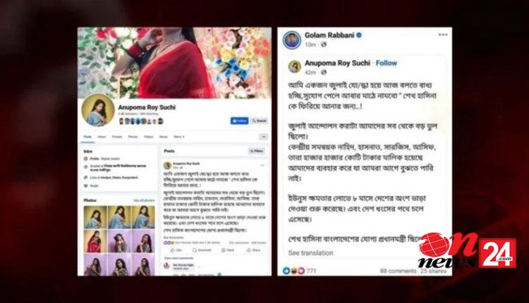 সম্প্রতি সামাজিক যোগাযোগমাধ্যম ফেসবুকে ‘অনুপমা রায় সুচি’ (Anupoma Roy Suchi) নামের একটি অ্যাকাউন্ট থেকে বিভ্রান্তিকর একটি পোস্ট ছড়িয়ে পড়ে, যেখানে নিজেকে ‘জুলাইযোদ্ধা’ পরিচয়ে পরিচিত করে দেয়া হয়েছে রাজনৈতিক বক্তব্যপূর্ণ একটি স্ট্যাটাস।