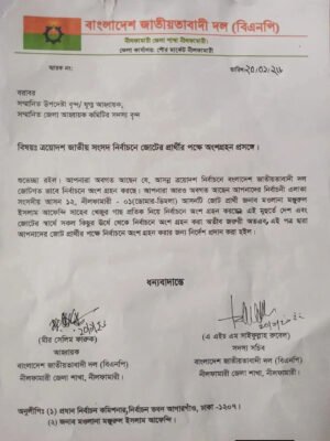 ​উল্লেখ্য, এই চিঠির অনুলিপি প্রধান নির্বাচন কমিশনার এবং সংশ্লিষ্ট প্রার্থী মাওলানা মঞ্জুরুল ইসলাম আফেন্দীকেও প্রদান করা হয়েছে।