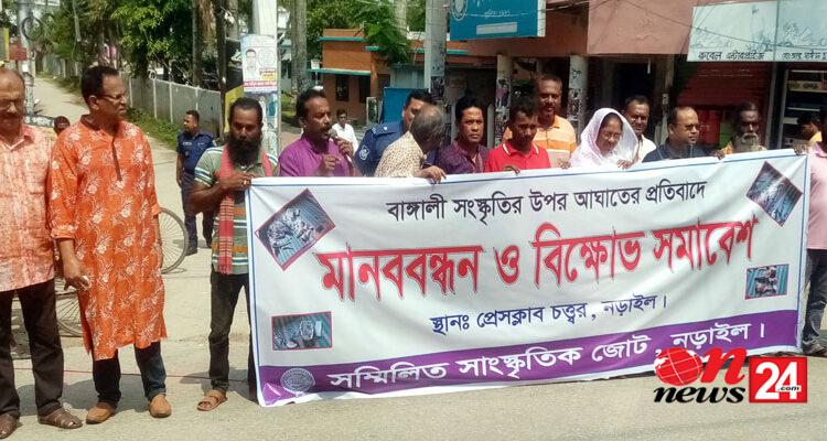 ঘন্টাব্যাপী মানববন্ধন ও বিক্ষোভ সমাবেশে সম্মিলিত সাংস্কৃতিক জোট নড়াইলের সভাপতি মলয় কুন্ডুর সভাপতিত্বে বক্তব্য দেন নড়াইল পৌরসভার মেয়র আঞ্জুমান আরা, জোটের সহ-সভাপতি মাহবুব-ই-রসুল অরুণ, সাধারন সম্পাদক শরফুল আলম লিটু, যুগ্ম সাধারন সম্পাদক মাহবুবুর রহমান লিটু, শামীমূল ইসলাম টুলু, মূর্ছনা সংগীত নিকেতনের যুগ্ম সাধারন সম্পাদক প্রভাষক প্রশান্ত সরকার, চিত্রা থিয়েটারের সাধারন সম্পাদক ইমান আলী মিলন, চিত্রা থিয়েটারের মুন্সি আসাদুর রহমান, নাজমুল হাসান লিজা, বঙ্গমাতা ফজিলাতুন্নেছা মজিব সংস্কৃতি চর্চা কেন্দ্রের সাধারণ সম্পাদক সালাউদ্দিন শীতল প্রমুখ।