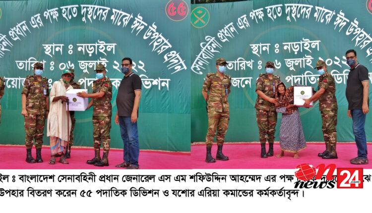 নড়াইলে পবিত্র ঈদ উল আযহা উপলক্ষ্যে বাংলাদেশ সেনাবহিনী প্রধান জেনারেল এস এম শফিউদ্দিন আহম্মেদ এর পক্ষ থেকে এক হাজার দুঃস্থ মানুষের মাঝে ঈদ উপহার বিতরণ করা হয়েছে।