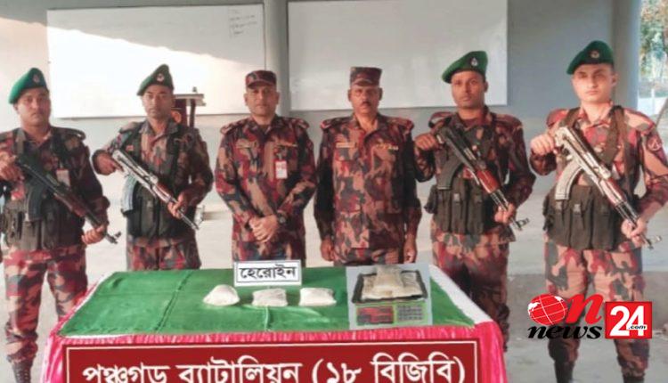 বিজিবি জানায়, পঞ্চগড় ১৮ বিজিবি ব্যাটালিয়নের অধীনস্থ পেদিয়াগছ বিওপি’র দায়িত্বপূর্ণ এলাকায় কর্মরত নায়েব সুবেদার মোঃ সৈবুর রহমানের নেতৃত্বে রোববার দুপুরে গোপন সংবাদের ভিত্তিতে অভিযান পরিচালনা করা হয়। এসময় সীমান্ত পিলার ৪৩১/৪-এস থেকে আনুমানিক ৮০০ মিটার বাংলাদেশের অভ্যন্তরে ডাহুক কমলা বাগান এলাকায় চেকপোষ্ট বসিয়ে বাংলাবান্ধা থেকে পঞ্চগড়গামী যাত্রীবাহি বাস এস আর পরিবহনে তল্লাশী করে মালিকবিহীন অবস্থায় বাসের ভিতরে বাঙ্কারে ১টি শপিং ব্যাগ থেকে ১ কেজি ৩৭ গ্রাম হেরোইন জব্দ করা হয়। তবে এসময় কাউকে আটক করা সম্ভব হয় নি।