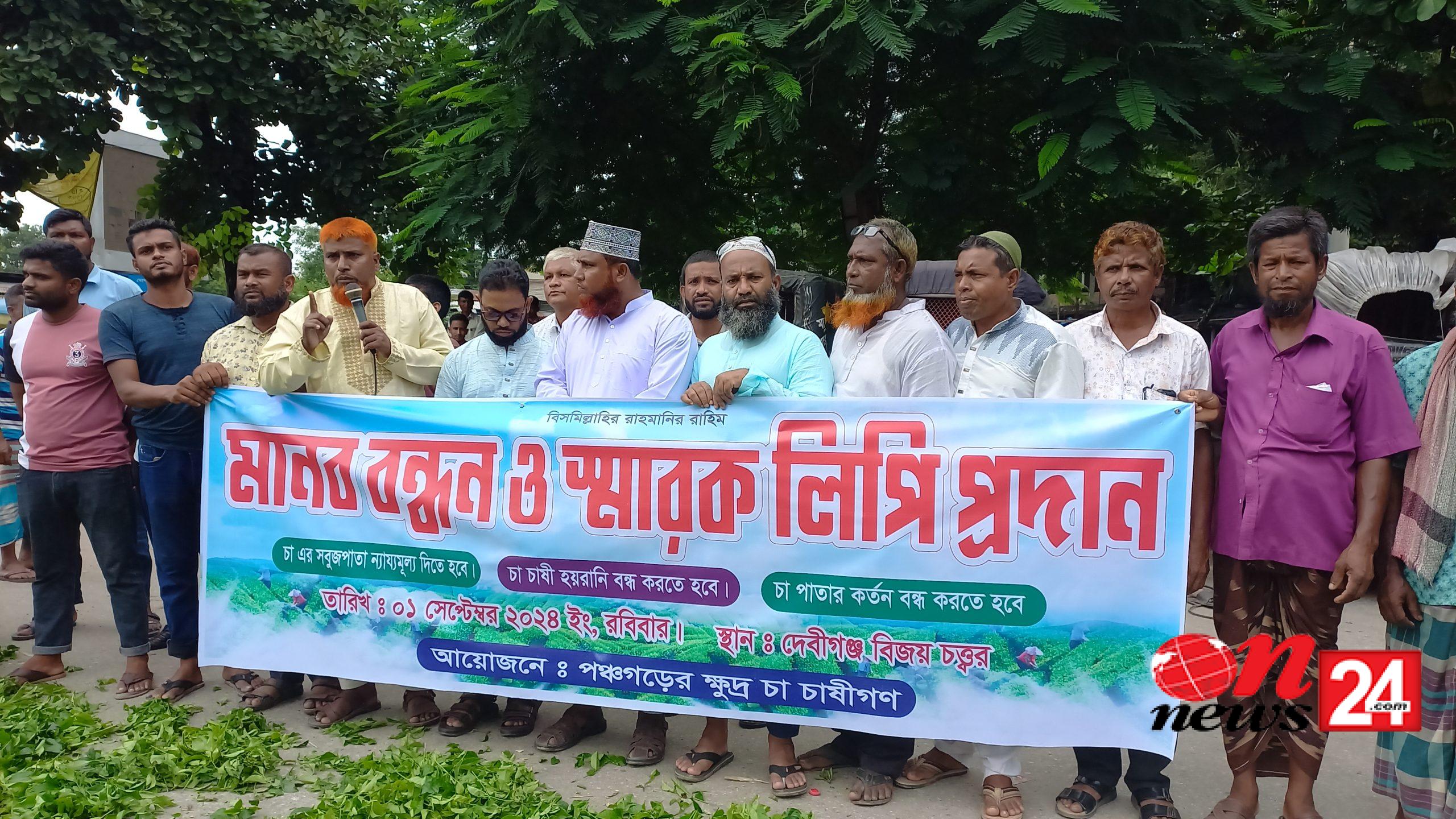 এ সময় মানববন্ধনে বক্তারা বলেন, ইংরেজরা যেমন নীল চাষে এদেশের চাষীদের রক্ত চুষে ছিল। তেমনি পঞ্চগড়ের চা-কারখানা মালিকসহ সিন্ডিকেট চক্রটি চা চাষীদের রক্ত চুষে খাচ্ছে। চাষীদের ন্যায্য মূল্য থেকে বঞ্চিত করা হচ্ছে। চা পাতার দাম কর্তন করে চাষীদের হয়রানি করা হচ্ছে। তৈরি চায়ের দাম বাজারে থাকলেও কাঁচা চা পাতা বিক্রির সময় চাষীরা নায্য দাম পান না। অনলাইন নিলাম কেন্দ্র হয়েও চাষিরা কোনভাবে উপকৃত হচ্ছেন না। অনেক চাষী আজ ঋণগ্রস্থ। ঋণের টাকায় চা বাগানের পরিচর্যা করছেন। কিন্তু কীটনাশক সহ শ্রমিক খরচে তারা তুলতে পারছেন না। অনেকে কারখানার মালিকদের নির্মম নির্যাতনের শিকার হয়ে চাষিরা দাম না পেয়ে গাছ তুলে ফেলতে বাধ্য হচ্ছেন।