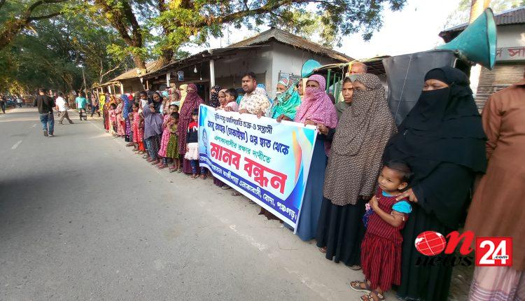 পঞ্চগড়ে জালিয়াতি ও সন্ত্রাসী কায়দায় স্থানীয়দের ১৫০ বিঘা জমি দখল করে মিথ্যা মামলা দেয়ায় গ্রামবাসীর মানববন্ধন