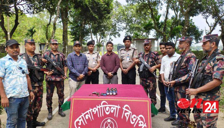 জানা গেছে, সোমবার দুপুরে গোপন সংবাদের ভিত্তিতে একটি বিশেষ অভিযান পরিচালনা করা হয়। এসময় জেলা প্রশাসন, গোয়েন্দা সংস্থা এনএসআই ও সোনাপাতিলা বিজিবি ক্যাম্পের সদস্যদের নিয়ে সোনাপাতিলা সীমান্ত এলাকার পশ্চিমপাড়া গ্রামের কুদ্দুসের বাড়িতে অভিযান পরিচালনা করা হয়। তল্লাশি চালিয়ে বাড়ির পূর্ব পাশের একটি খড়ির ঘরে মাটির নিচে পুতে রাখা অবস্থায় একটি দেশীয় তৈরি পিস্তল, দুই রাউন্ড গুলি এবং ছয় বোতল ভারতীয় ফেন্সিডিল উদ্ধার করে জব্দ করা হয়। একই সাথে জব্দ করা হয়েছে দুইটা বাটম ফোন। তবে অভিযানের সময় কাউকে আটক করা সম্ভব হয়নি।