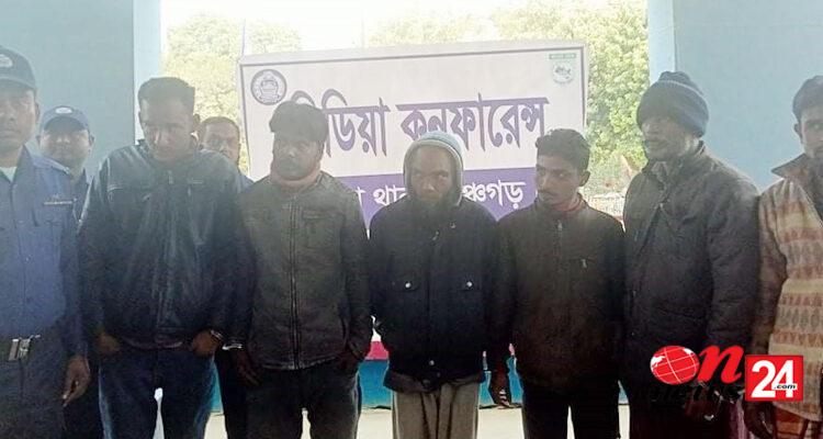 গ্রেফতারকৃতরা হলেন, মেনাগ্রামের মৃত নূর বকস্ সরকারের ছেলে সালাউদ্দিন বাবু (৪০), একই এলাকার আব্দুস সামাদের ছেলে আলম ওরফে জামাত (৫০), পাঁচপীর এলাকার নুরুল ইসলামের ছেলে জসিম উদ্দিন (২৮), পাঁচপীর উত্তর মাষানপাড়ার শ্রী পঞ্চানন রায়ের ছেলে মণি ভূষণ রায় (২৫), রাম গোবিন্দ হিসাবিয়া এলাকার মৃত রফিকুল ইসলামের ছেলে আব্দুল কাদের লিটন (২৮), কাহারগঞ্জ এলাকার নজরুল ইসলামের ছেলে বদিউজ্জামান রনি (৩০)।