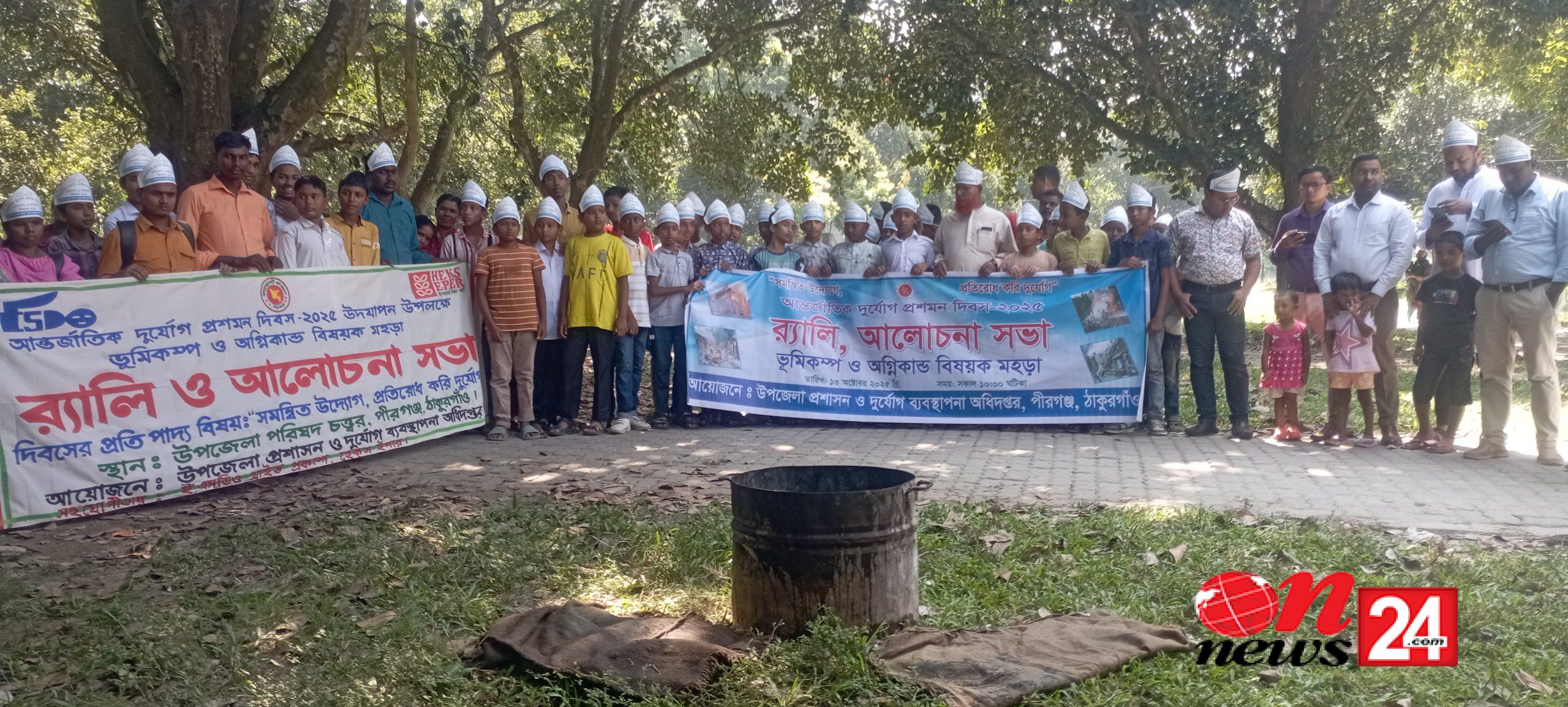 “সমন্বিত উদ্যোগ, প্রতিরোধ করি দুর্যোগ” এই প্রতিপাদ্যকে সামনে রেখে ঠাকুরগাঁওয়ের পীরগঞ্জে পালিত হয়েছে আন্তর্জাতিক দুর্যোগ প্রশমন দিবস। দিবসটি উপলক্ষে সোমবার সকালে উপজেলা প্রশাসন ও দুর্যোগ ব্যবস্থাপনা অধিদপ্তরের যৌথ উদ্যোগে একটি র্যালি ও ভূমিকম্প এবং অগ্নিকাণ্ড বিষয়ক মহড়ার আয়োজন করা হয়। উপজেলা পরিষদ চত্বরে অনুষ্ঠিত এই কর্মসূচির শুরুতে একটি সচেতনতামূলক র্যালি বের করা হয়, যা বিভিন্ন সড়ক প্রদক্ষিণ করে। এরপর অনুষ্ঠিত হয় ভূমিকম্প ও অগ্নিকাণ্ড প্রতিরোধ ও মোকাবিলায় করণীয় বিষয়ক বাস্তব মহড়া, যেখানে স্থানীয় জনসাধারণ ও শিক্ষার্থীদের অংশগ্রহণের মাধ্যমে সচেতন করা হয়। অনুষ্ঠানে উপস্থিত ছিলেন উপজেলা নির্বাহী অফিসার রকিবুল হাসান, প্রকল্প বাস্তবায়ন কর্মকর্তা তারিফুল ইসলাম, সাবেক উপজেলা ভাইস চেয়ারম্যান ইত্তেশাম উল হক মিম, পীরগঞ্জ প্রেসক্লাবের সাধারণ সম্পাদক নসরতে খোদা রানা, উপজেলা দুর্নীতি প্রতিরোধ কমিটির সাধারণ সম্পাদক মোকাদ্দেস হায়াত মিলনসহ গণ্যমান্য ব্যক্তিবর্গ।