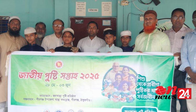 “শিশু থেকে প্রবীণ পুষ্টিকর খাবার সর্বজনীন” এই প্রতিপাদ্যকে সামনে রেখে জাতীয় পুষ্টি সপ্তাহ উপলক্ষে ঠাকুরগাঁওয়ের পীরগঞ্জ উপজেলার হামিউস সুন্নাহ হাফিজিয়া কওমী মাদ্রাসা ও এতিমখানার প্রায় দেড় শতাধিক শিক্ষার্থীদের মাঝে পুষ্টিকর খাবার হিসেবে ডিম বিতরণ করা হয়েছে। সোমবার দুপুরে জনস্বাস্থ্য পুষ্টি প্রতিষ্ঠানের আয়োজনে উপজেলা স্বাস্থ্য কমপেক্স এ কর্মসূচী বাস্তবায়ন করে। এ সময় উপজেলা নির্বাহী অফিসার রকিবুল হাসান, উপজেলা স্বাক্ষ্য কমপ্লেক্সের আবাসিক মেডিকেল অফিসার (আরএমও) ডাঃ আব্দুর রহমান সোহান, উপজেলা মাধ্যমিক শিক্ষা অফিসার আরিফুল্লাহ, উপজেলা মহিলা বিষয়ক কর্মকর্তা জিন্নাতারা ইয়াসমিন, উপজেলা সমাজ সেবা কর্মকর্তা রফিকুল ইসলাম, পীরগঞ্জ প্রেসক্লাবের সভাপতি জয়নাল আবেদিন বাবুল, সাধারণ সম্পাদক নসরতে খোদা রানা, উপজেলা স্বাস্থ্য কমপ্লেক্সের প্রধান সহকারি মাইজুল ইসলাম সহ স্থানীয় গণ্যমান্য ব্যক্তিবর্গ উপস্থিত ছিলেন।