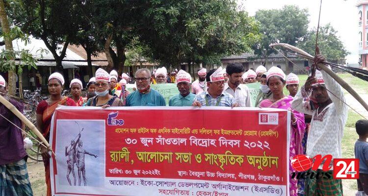 ঐতিহাসিক সাঁওতাল বিদ্রোহ দিবস উপলক্ষেঠাকুরগাঁওয়ের পীরগঞ্জে র্যালি ও আলোচনা সভা অনুষ্ঠিত হয়েছে।বৃহস্পতিবার সকালে জাতীয় আদিবাসী পরিষদ ও বেসরকারি সংস্থা ইএসডিও-এরআয়োজন বৈরচুনা উচ্চ বিদ্যালয় থেকে একটি র্যালি বের করা হয়। পরে বৈরচুনাউচ্চ বিদ্যালয় হল রুমে সংক্ষিপ্ত আলোচনা সভা অনুষ্ঠিত হয়। এ সময় বক্তব্য রাখেন, উপজেলা মহিলা ভাইস চেয়ারম্যান ভারতী রাণী, বীর মুক্তিযোদ্ধা হাফিজুর রহমান, এ্যাডভোকেসি ম্যানেজার ইএসডিও প্রেমদ্বীপ প্রকল্প শাহ আমিনুল হক, উইমেন ইমাওয়ার অফিসার ইএসডিও প্রেমদীপ মরমীতাজ ইসলাম, বৈরচুনা উচ্চ বিদ্যালয়ের প্রধান শিক্ষক জহিরুল ইসলাম, উপজেলা ম্যানেজার প্রেম দ্বীপ প্রকল্প ওয়ালীউর রহমান, ইকোনোমিক ডেভলপমেন্টঅফিসার প্রেম দ্বীপ প্রকল্প রোশন জামাল চৌধুরী, আদিবাসী সদস্যদের মধ্যেবক্তব্য রাখেন পারগানা পরিষদের সভাপতি দাউদ সরেন, আজলাবাদ গ্রাম ইউনিয়ন কমিটির সাধারণ সম্পাদক লুকাস টুডু।