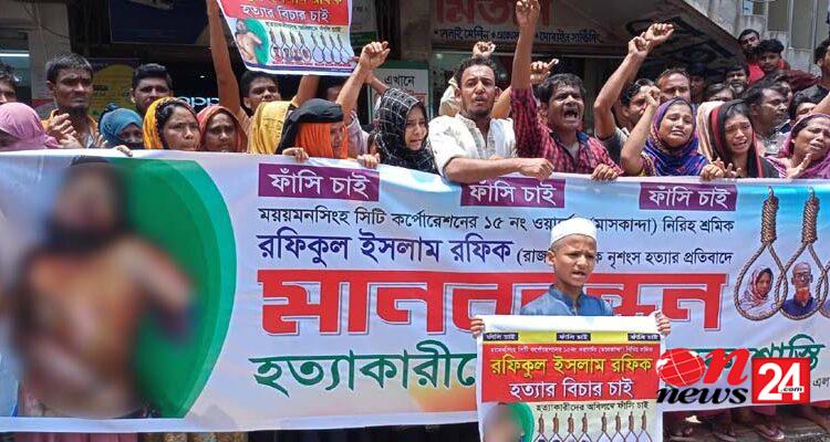 ময়মনসিংহে প্রেমের বিয়ের ঘটনার জের ধরে ছেলের মায়ের হাতে মেয়ের বাবা রাজমিস্ত্রী রফিকুল ইসলাম হত্যাকান্ডে জড়িতদের দৃষ্টান্তমূলক শাস্তির দাবিতে বিক্ষোভ মিছিল ও মানববন্ধন অনুষ্ঠিত হয়েছে।
